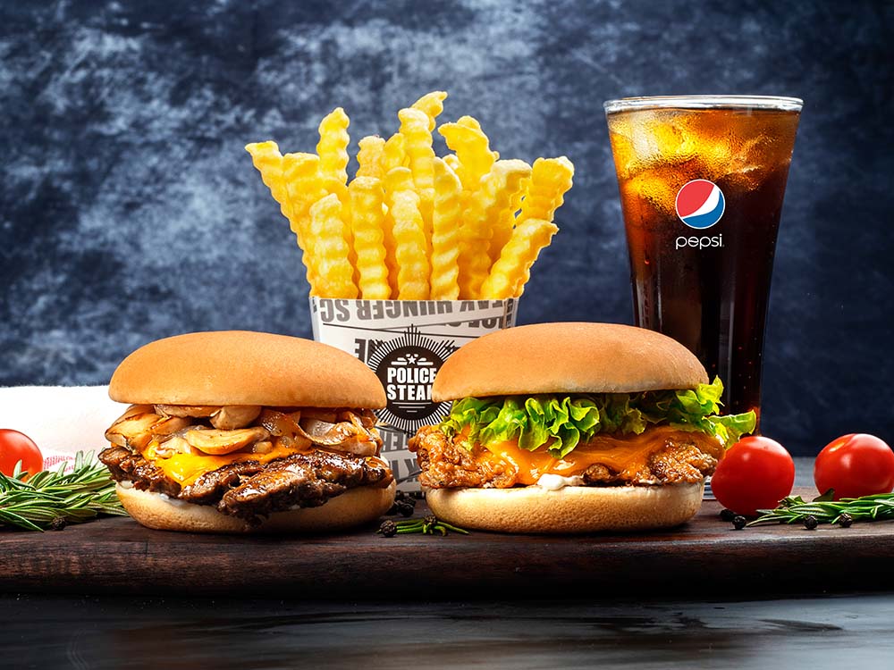 سندويش من صدر الدجاج المتبل بخلطة بوليس السرية مع الخس الأمريكي وجبن الشيدر الذهبي والمايونيز في خبز البريوش المعد خصيصًا لك وساندويتش من قطع اللحم البقري الباراجوياني المميزة مع الفطر والبصل المطبوخ مع بهارات بوليس السرية وجبن الشيدر الذهبي مع صوص لحم بوليس الخاص ومايونيز بخبز البريوش المعدد خصيصا لكم مع شيبس وبيبسي