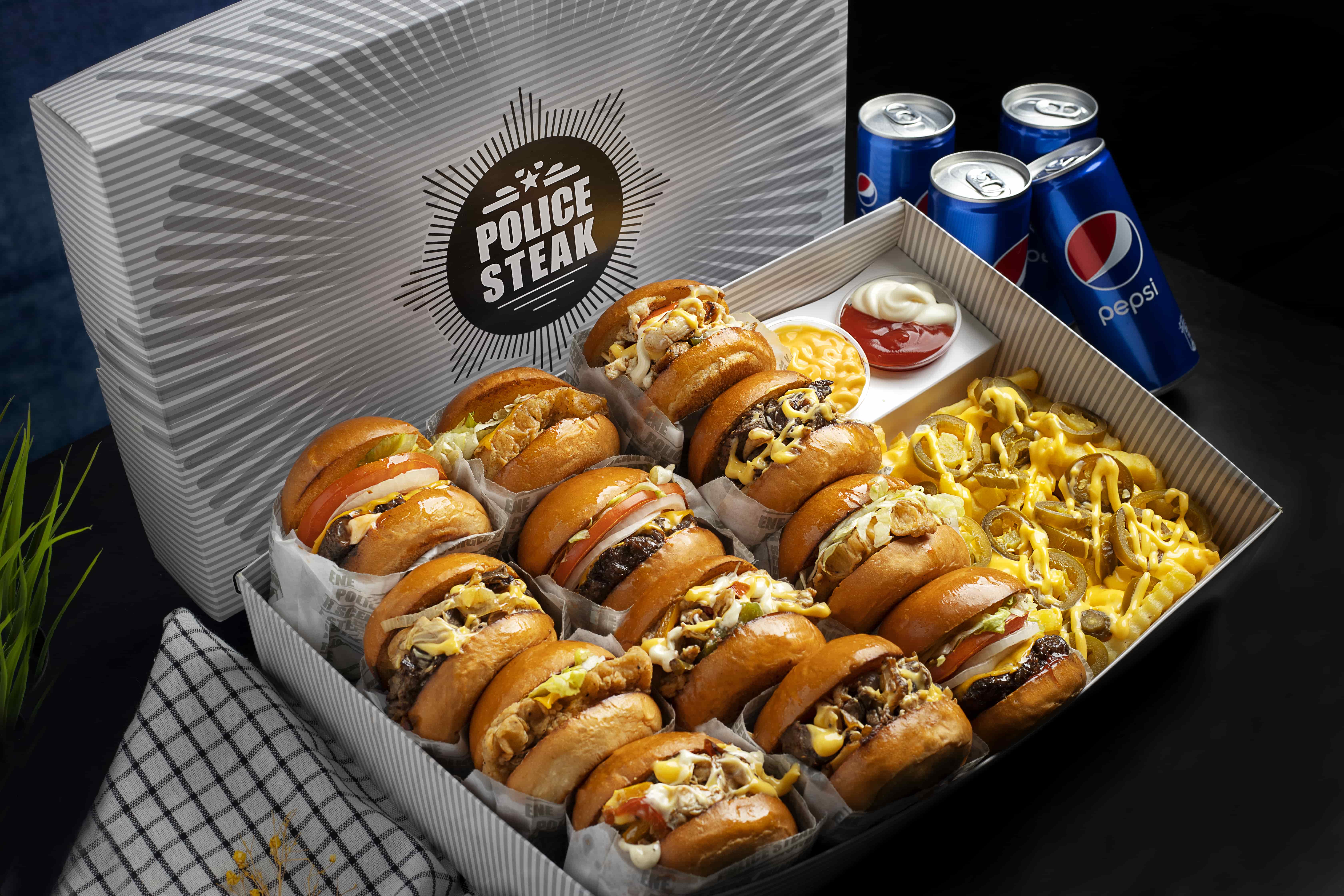 3 ميني سندوتش من قطع ستيك لحم باراجواي المميز مع المشروم والبصل المطبوخ ببهارات بوليس السرية وجبنة الشيدر الذهبية مع صوص لحم بوليس الخاص والمايونيز بخبز البريوش السلايدر 3 ميني سندوتش من فيليه صدور الدجاج المتبل بخلطة بوليس السرية مع الخس الأمريكي وجبنة الشيدر الذهبية والمايونيز بخبز البريوش السلايدر المعد خصيصا لكم 3 ميني سندوتش من البرجر الأنجوس الأمريكي الشهي مع جبنة الشيدر الذهبية والطماطم والبصل والخس الأمريكي مع المايونيز والكاتشب بخبز البريوش السلايدر المعد خصيصا لكم 3 ميني سندوتش من قطع دجاج متبلة بخلطتنا السرية مع فلفل ألوان حلوه وصوص رانش بوليس ستيك الخاص وصوص الجبن والمايونيز الحار بخبز بخبز البريوش السلايدر مع شيبس بصوص الجبن الشهي وقطع الهالوبينو اللذيذة و ٤ بيبسي.